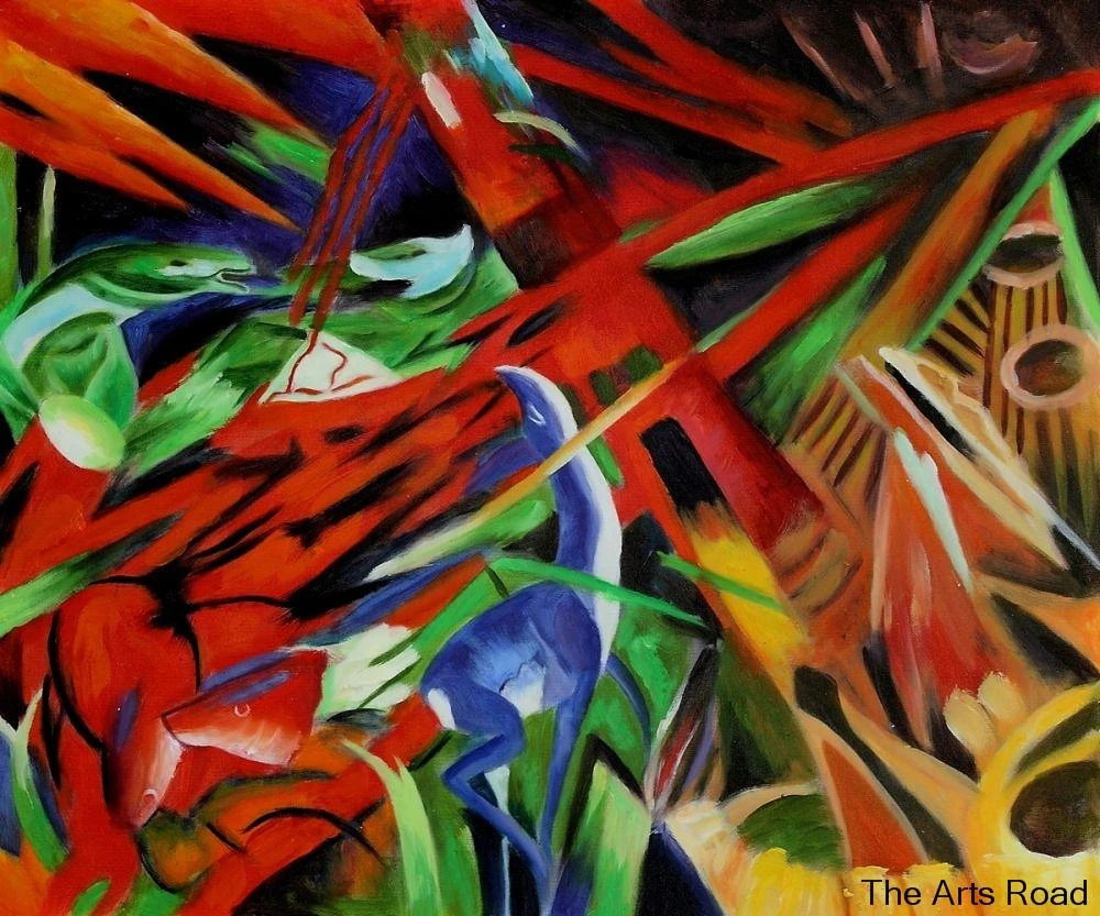Fate Of The Animals : Museum Quality Abstract Art Reproduction Samples Hand Painted Replicas - At the start of the book, representatives of the various animal species have convened to take a vote on what they.. This painting shows agony and tension which is caused from perpetual war. Marc's strong ties with animals as his subjects remains uncertain, but it is predicted to stem from his childhood dog. The sharp angles and jagged shapes of the composition convey marc's more jaded view of the relationship between man and nature. This work contrasts most of marc's other works by presenting animals in a brutal way rather than depicting them in a peaceful manner. Poetic lyrics rhyme resilient dialogue, dancing through puns of life's essence until a revelation, it was the fate of all animals exposes the crux of insanity as a necessary change of perspective to understand the world within the context of significant loss.